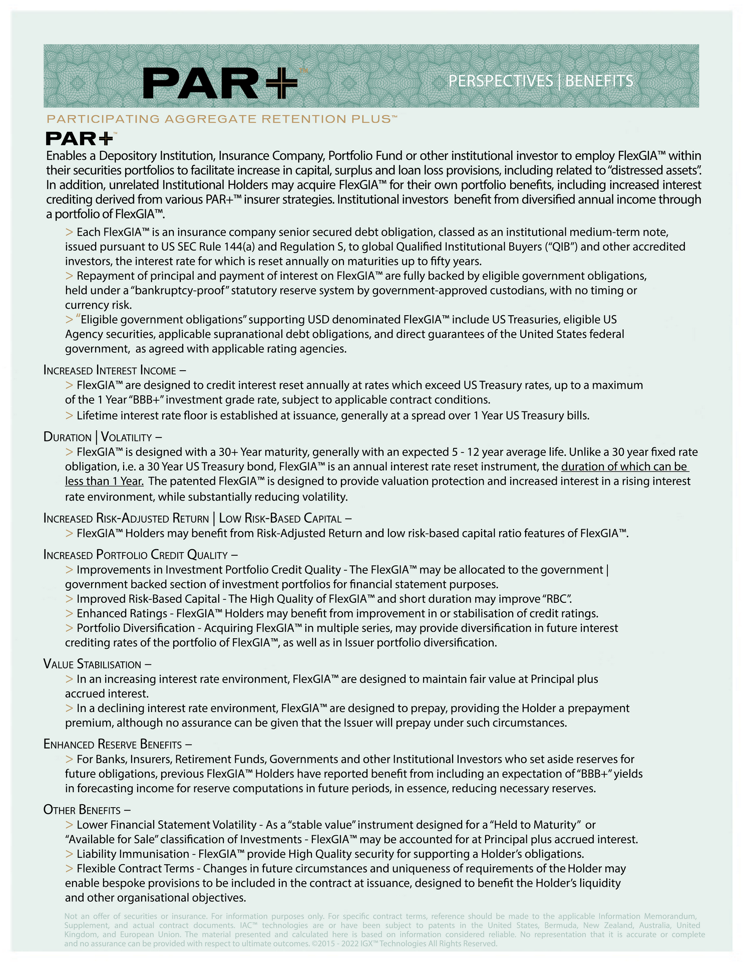 PAR+™ FlexGIA Series extend the platform into risk transfer. It enables parties to shift defined exposures to IAC™ Insurers, where they may be retained on balance sheet or securitized into the capital markets. Each PAR+™ Series is issued as a FlexGIA™, creating an instrument that combines high quality reserve security with bespoke risk coverage. Importantly, the transferring party may also acquire a portion of the PAR+™ Series, aligning interests while reducing net exposure.